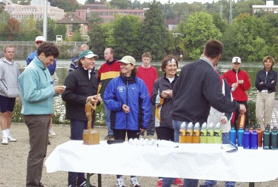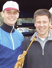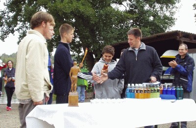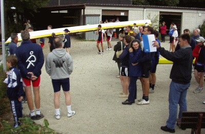 Thomas Goecke errang zum dritten Mal in Folge des begehrte "Holz-Männle", den Pokal für den Vereinsmeister im Einer. (Manfred Neubert strahlt, weil die Clubregatta so sauber und harmonisch über die Bühne gegangen ist.) |